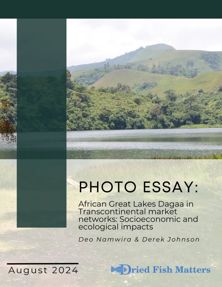 The African Great Lakes (AGL) are amongst the most important freshwater ecosystems globally, with fisheries that employ over 5 million people, of which 3 million people are involved in small-scale fisheries (WorldFish, 2021), with women representing 44%, of whom 88% are fish processors and traders (FAO in WoldFish, 2021). Small fish species, in dried form, dominate fish supplies in markets. This photo essay maps out the value chain of the African Great Lakes (AGL) small pelagic fish of Lake Tanganyika (fished from Tanzania and DR Congo) and Lake Victoria (fished mainly from Uganda and Kenya). It shows the context of socioeconomic value and environmental impact that the transcontinental women-led dried fish markets have on people’s livelihoods and fisheries’ sustainability. AGL small species, named Dagaa, make up 75% of catches from nearly all African lakes. Lake Tanganyika and Lake Victoria are leading fish-producing inland lakes, mainly where Dagaa are fished and processed, with contributions of over 60% to the catches of both lakes. Thus, the second-most important species traded and consumed locally and across the region and the world. Photos are organized in categories of identified segments of the Dagaa value chain, mapping the export/import women-led dried fish business networks between the AGL region and Canada. Using the Structure-Conduct-Performance model and Political Ecology thinking, the essay highlights that AGL Dagaa fisheries use small-scale assets. While men handle fishing and distribution, women dominate processing and trading at landing sites. Imported Dagaa in Canada primarily serves the African diaspora, with high prices reflecting its cultural value. The essay underscores the need for research and policies for markets balancing exported and Canadian small fish to reduce pressure on AGL fisheries and create economic opportunities in Canada.