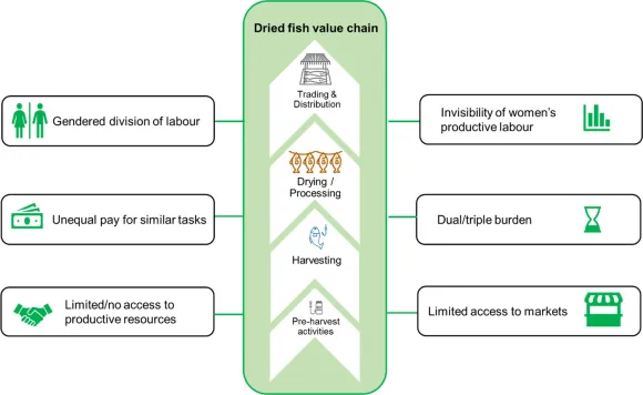 Galappaththi et al. explore gender relations in dried fish value chains, proposing an analytic framework that links gender, wellbeing creation, and intersecting structural oppressions within dried fish value chains, with an overarching focus on relationality.