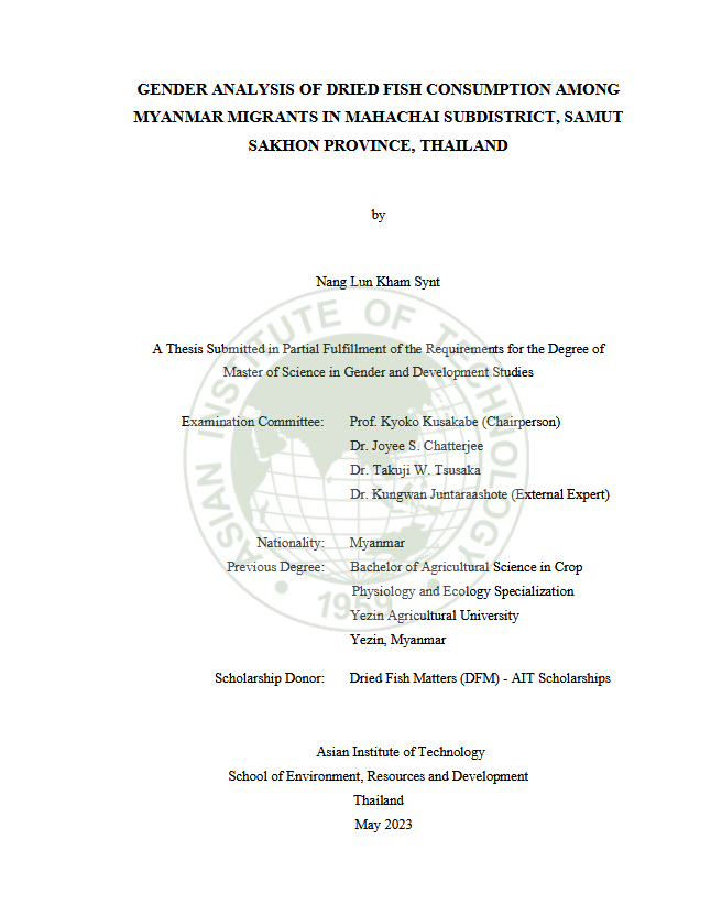 Synt, N. L. K. (2023). Gender analysis of dried fish consumption among Myanmar migrants in Mahachai Subdistrict, Samut Sakhon Province, Thailand [Master’s thesis]. Asian Institute of Technology.